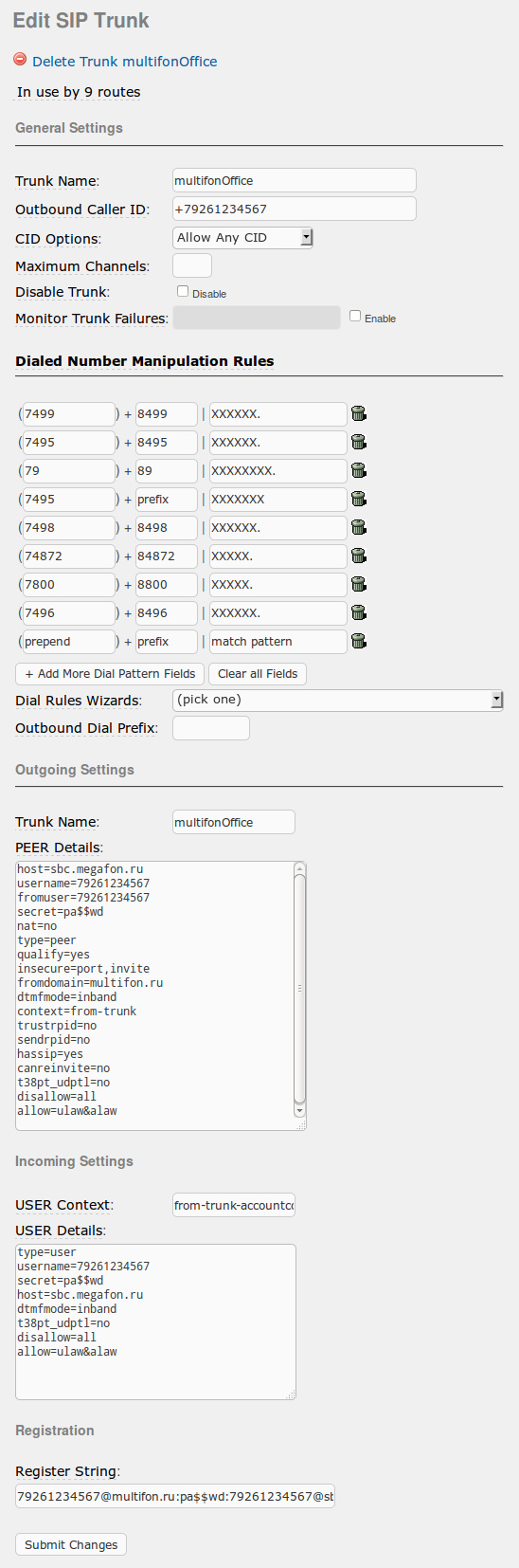 где username - номер телефона, настраиваемой SIM-карты и secret пароль, полученный от сервиса Мультифон при регистрации услуги; host=sbc.megafon.ru адрес SIP-сервера Мегафона; qualify=yes требование регулярно проверять соединение и задержку (по команде show peers в меню Elastix/PBX/Tools можно увидеть статусы линий и абонентов); canreinvite=no устанавливать соединения через Elastix (для исключения односторонней слышимости, когда на пути между абонентами используется NAT); dtmfmode=inband передача DTMF-тонов в виде звуков для корректной работы с IVR при исходящей связи; disallow=all, allow=ulaw&alaw разрешить использовать только кодек G.711 (ulaw или alaw, позволяющие нормально передавать не только речь, но и DTMF-тона).