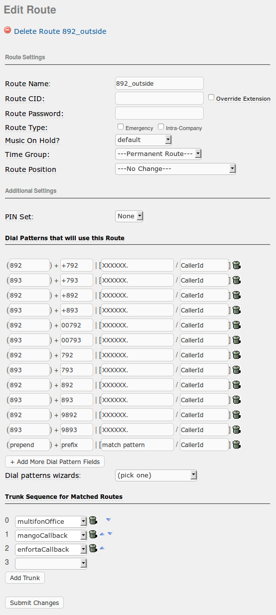 Dial Patterns фильтр подходящих номеров и алгоритм их преобразования (prefix заменяемое начало номера, prepend на что заменяется начало номера, match pattern фильтр подходящих номеров; в данном примере позволяются звонки на номера Мегафона в индексах 92х и 93х)