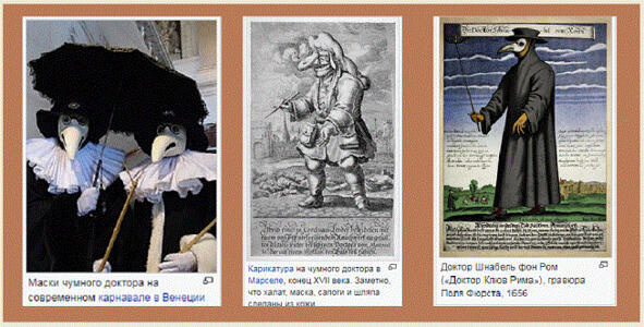 «Чумной доктор, или врачеватель чумы (англ. plague doctor, нем. Pestarzt, итал. physici epidemeie) устоявшееся в средневековой и ренессансной Европе название врача, основной обязанностью которого являлось лечение больных бубонной чумой, или «чёрной смертью», в особенности во время эпидемий. Начиная с XVII века отличительной особенностью чумных докторов стал особый защитный костюм с оригинальной «носатой» маской, напоминающей клюв птицы.