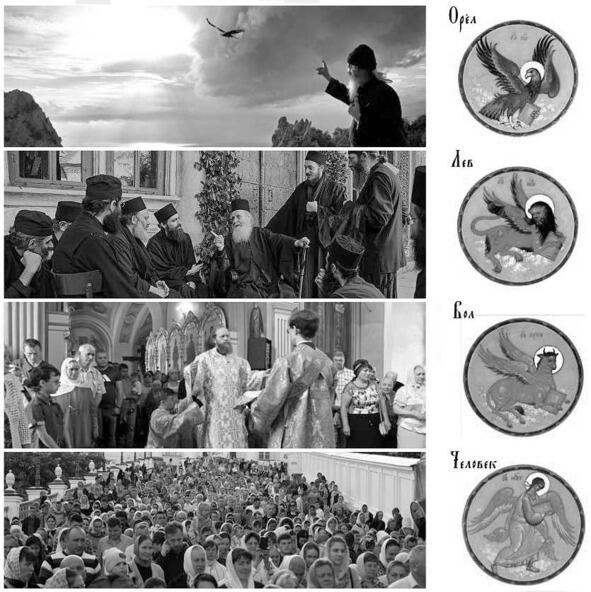 Говоря о согласном учении отцов невозможно не коснуться темы «тетраморфа» или сакральных символов Четвероевангелия Человек, Вол, Лев и Орёл, соответствующих четырём каноническим Евангелиям от Матфея, от Луки, от Марка и от Иоанна, которые являются одним из важнейших духовных кодов христианства, православия и согласного учения отцов.