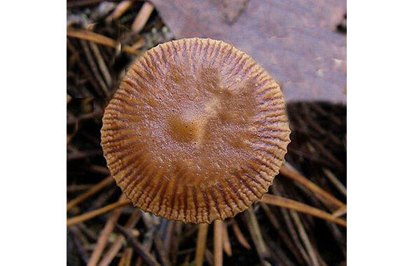 Шляпка имеет диаметр 1 4 см, сначала выпуклая, позже выпукло распростертая. Отличительным свойством вида является коричневатая шляпка с бугорком по середине, бороздчатыми краями и наличием кремовых или светло-коричневых пятен в центральной области. Края шляпки часто бывают более светлые.
