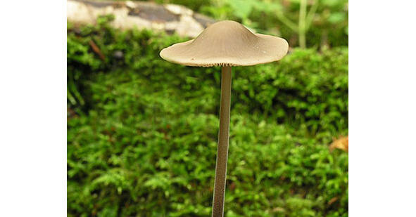 Ножка тонкая, 38 см высотой, 0,6 3 мм толщиной, твердая, сначала сверху кремовая, ниже коричневатая, позже вся коричневая с опушением возле основания.