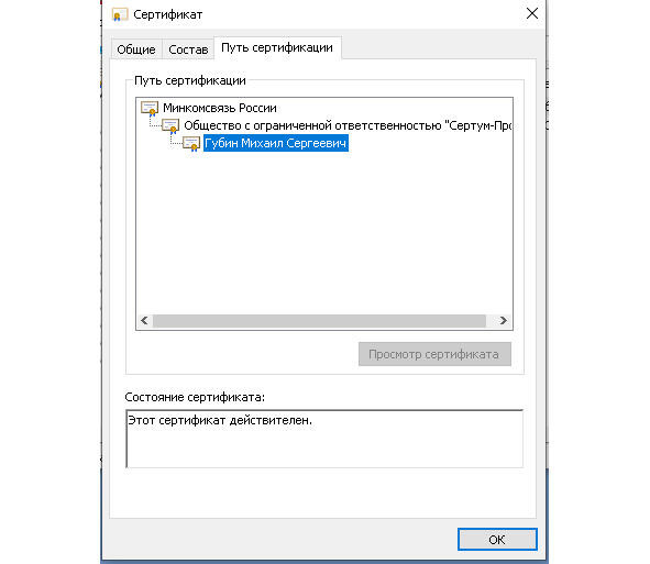 Как мы видим, цепочка сертификатов построена не абы как. Самым верхним является сертификат Министерства цифрового развития, связи и массовых коммуникаций Российской Федерации (Минкомсвязь) России, поскольку именно Минкомсвязь вместе с ФСБ России разрешает всем без исключения удостоверяющим центрам вести свою деятельность. После сертификата Минкомсвязи идет сертификат текущего удостоверяющего центра это общество с ограниченной ответственностью «Сертум-Про», входящее в состав компании СКБ «Контур». Самым последним в цепочке выступает мой сертификат. У вас цепочки сертификатов будут иметь похожую структуру, причем Минкомсвязь будет обязательным элементом, а удостоверяющий центр и название компании либо физического лица будут уже вашими.