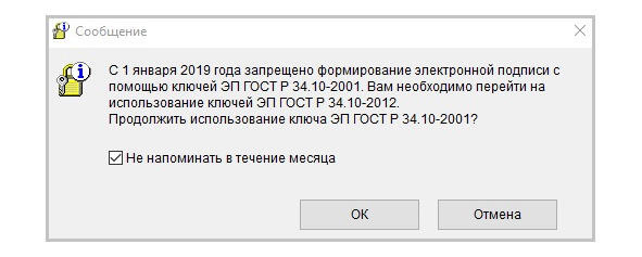 Ранее пользователи использовали устаревший ГОСТ Р 34.102001 (кратко ГОСТ 2001), принятый постановлением Госстандарта России 380-ст от 12 сентября 2001 года. Но время идет, требуются все более мощные способы защиты информации, и ГОСТ 2012 начал потихоньку вытеснять ГОСТ 2001 с персональных компьютеров пользователей. Фактически, ГОСТ 2001 уже запрещен, выпуск электронных подписей по нему не производится, а сам ГОСТ 2001 не работает с 1 января 2020 года. Пользователям, которые его использовали в 2019 году, выводилась вот такая табличка:
