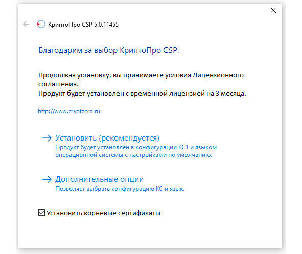 Окно приглашения одинаково для всех версий КриптоПро, вне зависимости от того, какую версию вы устанавливаете.