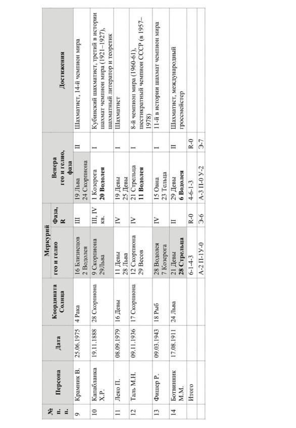 по Меркурию: существенное преобладание I фазы у 6 человек (42,8%); ретро движение отсутствует; элонгация планеты проявлена у 6 человек; афелий, перигелий и узлы выражены слабо.