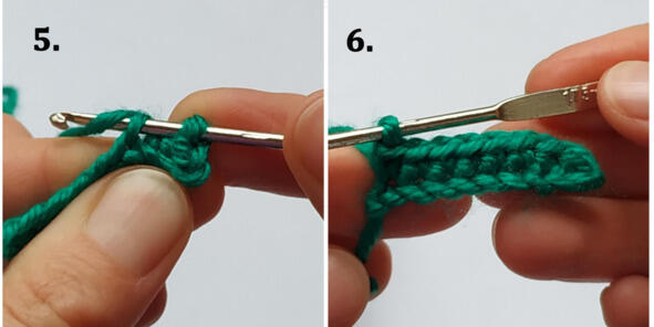 5. Далее крючок проденьте в следующую петельку цепочки воздушных петель и аналогично свяжите второй столбик без накида.