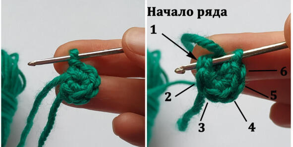 2. В первую петлю (это вторая петля от крючка) связать 6 столбиков без накида.