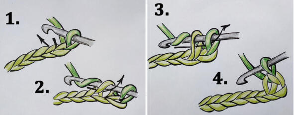 1. Проденьте крючок во вторую петлю от крючка (воздушную петлю).