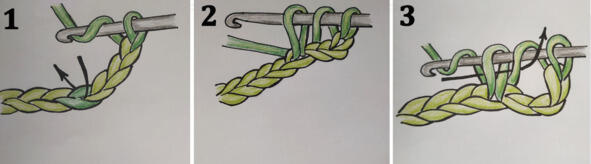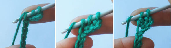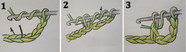 1. Накиньте рабочую нить на крючок как показано на рисунке ниже. Проденьте крючок в петлю предыдущего ряда.