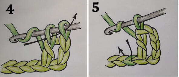 1. Накиньте рабочую нить два раза на крючок как показано на рисунке ниже. Проденьте крючок в петлю предыдущего ряда.