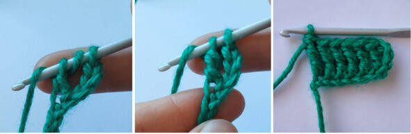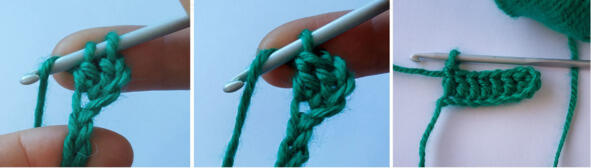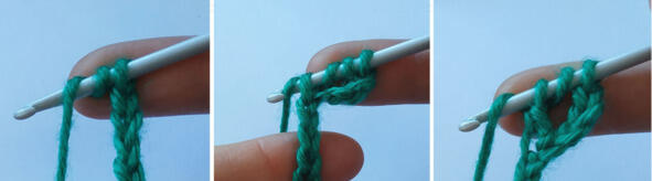2. Захватите рабочую нить и протяните ее через петлю предыдущего ряда. На крючке у вас должно получиться 3 петли.