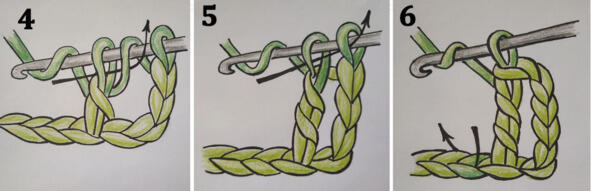 2. Захватите рабочую нить и протяните ее через петлю предыдущего ряда. На крючке у вас должно получиться 4 петли.