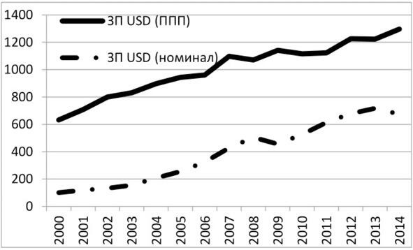 Ниже приведена динамика роста заработных плат по паритету покупательной способности и по номинальному курсу.