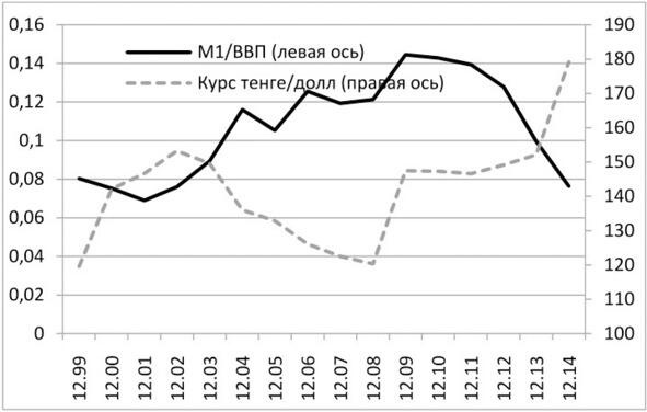 Ниже приведен график агрегата M1/ВВП и курса тенге к доллару, по данным Национального банка РК. Денежный агрегат М1 это количество тенге в экономике как наличных, так и безналичных. Понятно, что чем больше ВВП, тем больше денег нужно, чтобы обслуживать расчеты между субъектами экономики, бизнесом и населением. Из графика видны проблемы голландской болезни: сильное укрепление тенге на фоне резкого роста его количества, для того чтобы хоть как-то компенсировать наплыв валюты.