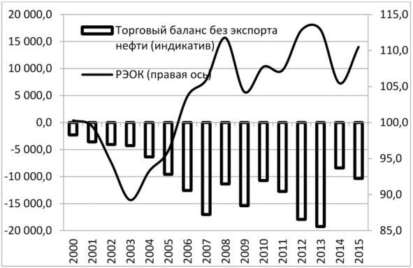 Ниже приведена динамика индекса РЭОК (реального эффективного обменного курса) (правая ось) и дефицита ненефтяного торгового баланса.