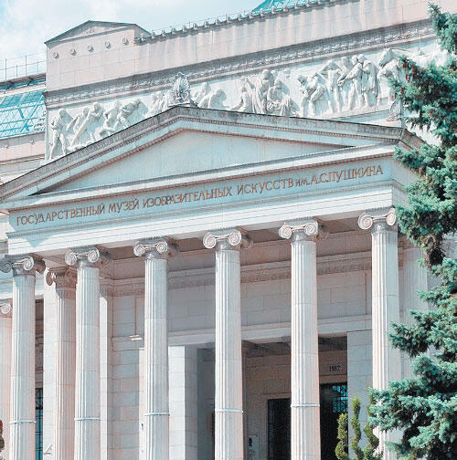 Музей изобразительных искусств на Волхонке, 12, Пушкинский, как говорят москвичи, мы уже видели издали, но его главное здание обязательно надо осмотреть и вблизи. У нас не много построек из настоящего мрамора. Как сетовал создатель музея профессор Иван Цветаев, «камня под ногами нет, и расстояния не итальянские». Но благодаря главному меценату музея Юрию Нечаеву-Мальцову кирпичное здание музея облицовано финским гранитом и белым уральским мрамором. Посетители обычно окидывают поверхностным взглядом такой привычный фасад и спешат внутрь на новую выставку. А перед музеем стоит постоять, чтобы рассмотреть барельефы. Над фронтоном расположена работа «Олимпийские игры» скульптора Гуго Залемана. Это оригинальная работа, а вот за колоннами галереи помещена копия. Но копия уникальная. В V веке до нашей эры. Фидий украсил колоннады Парфенона барельефом «Панафинейская процессия». Сохранившиеся плиты фриза работы Фидия были вывезены в Англию. Для московского музея ученый Георг Трей домыслил недостающие части, и по его рисункам скульптор Амбрустер вырубил из тирольского мрамора копию «Панафинейской процессии» Парфенона.