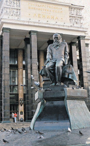 На террасе перед библиотекой в 1997 году был установлен памятник Достоевскому работы Александра Рукавишникова. Этот автор поставил за последние годы в столице больше 30 скульптурных групп. Число впечатляет, также впечатляет не частое во все времена совпадение таланта и востребованности. Москвичи сразу стали потешаться над памятником писателю. Иронизировали по поводу его болезненной позы, словно Достоевский ерзает от колик. Кто-то из профессионалов сказал, что не понимает, на чем сидит писатель, мол, под ним странный архитектурный облом, накрытый скатертью. А на постаменте вообще изображена Нева, хотя Достоевский родился в Москве и его многое связывает с нашим городом. Я тоже соревновался в остроумии Но по прошествии двадцати лет, сравнивая Достоевского с другими новыми и в основном безликими монументами, я радуюсь, что писатель такой неоднозначный, что было время, когда можно было ваять сложный образ, и что на фоне Кремля видна не очередная победная фигура с мечом, а согбенная спина писателя-страдальца.