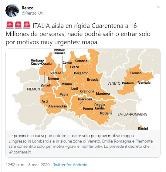 Su modello della decisione adottata dalla Cina e in seguito al numero crescente di casi di cittadini contagiati, lItalia ha attuato poi le stesse misure restrittive in termini di possibilità di movimento in alcune delle regioni settentrionali, una decisione adottata il 7 di Marzo 2020, per poi estendere la quarantena allintero Stato.al fine di prevenire gli effetti letali del contagio da COVID-19. Ma poi ogni Stato del mondo ha adottato misure simili, optando in ogni caso per la chiusura parziale o totale delle attività non essenziali, o chiudendo letteralmente il territorio per impedire agli stranieri infetti di diffondere la malattia nel proprio territorio. (@Renzo_Utili, 2020) (vedi Figura 9).