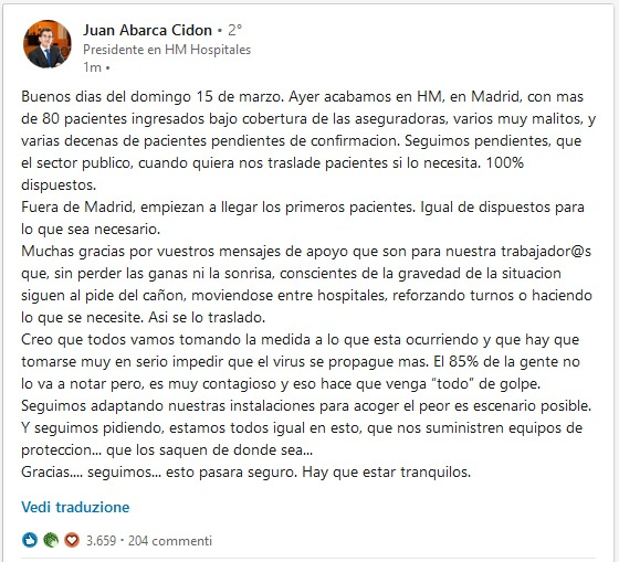 Traduzione:Il Buongiorno di domenica 15 marzo. La giornata di ieri in HM a Madrid è terminata con lingresso di altri 80 pazienti in modalità di sicurezza, e molti stavano davvero male. Rimaniamo in attesa di eventuali altri pazienti, disposti ad accoglierli al 100%.