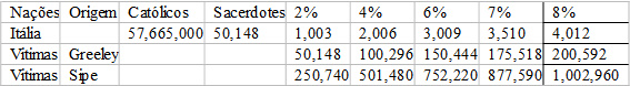 Importante! Lendo a declaração de monsenhor Betori, secretáriogeral dacongregação Episcopal italiana de Maio de 2002: os padres pedófilossão um caso absolutamente marginal que não requer intervenções daparte das instâncias centrais da igreja italiana, a suadeclaração pareciame bastante superficial. Por isso resolvi fazer aminha pesquisa. Na internet encontrei um sitio,http://retelabuso.org, onde demonstram: segundo a projecção do colega irlandêsMark Vincent Healy, que na base dos dados emitidos pelascomissões governamentais do inquérito efectuado em todo mundoproduziu uma projecção do dado italiano, a consequência dos abusos naItália tem um potencial para ser o mais grande de qualquer país() segundo a percentagem dos sacerdotes considerados pedófilos2%, 4%, 6%, etc. Estiveram em condições de estimar o número dospadres pedófilos na Itália na base da tal percentagem () FrAndrew M. Greeley, professor de sociologia na universidade deChicago, que acredita que existam 50 vítimas para um sacerdote. A. W.Richard Sipe era assistente psicoterapeuta e psiquiatra no estadode Maryland. Se lês o relatório Sipe afirma: estudos bem consolidados mostram que o pedófilo médio tem 250 ou maisvítimas no decorrer da sua vida. Aqui está a percentagem dospedófilos entre sacerdotes na Itália segundo os relatórios de Fr M.Greeley e A. W. Richard Sipe11 12 anos depois da declaração de monsenhor Betori. Nãocreio, que no decurso De 12 anos a situação podia mudar de forma tão drástica12 :