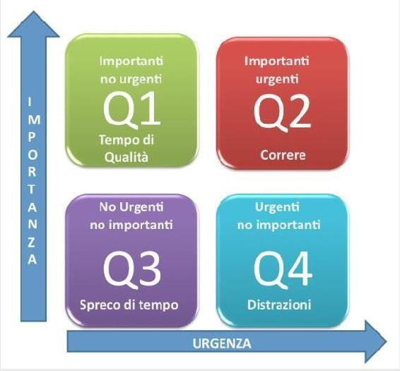 El Q1, come se evidencia en el esquema de abajo, es donde pasáis el tiempo de calidad. Anticipad, por lo tanto, los trabajos importantes antes de que se conviertan en urgentes; es inútil que os diga que las cosas no importantes deben tener poco espacio en vuestra jornada ¡no tenéis tiempo!