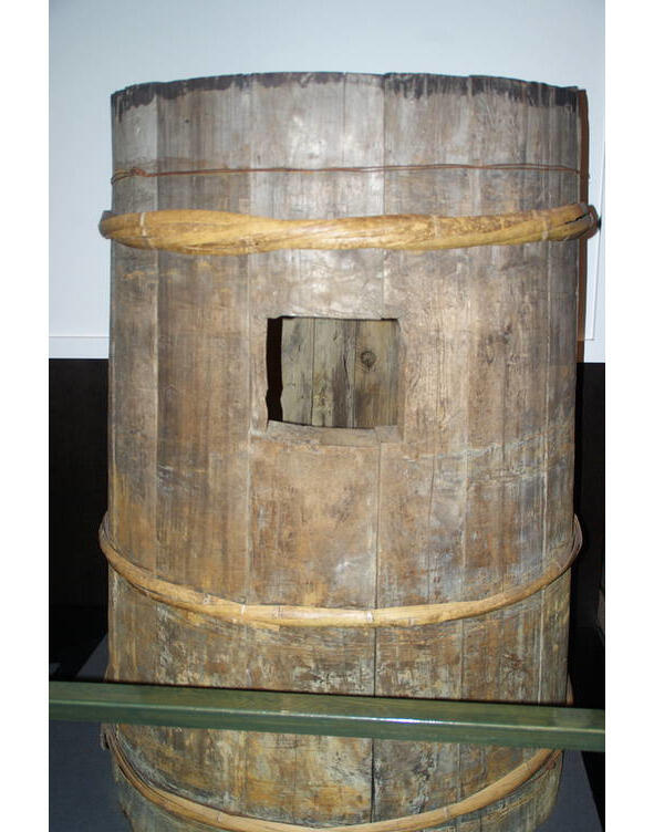 Бочка с квадратным отверстием. Для чего оно я так и не нашел ответа в инете. Возможно, это «бочка позора» для пьяниц. Днища нет, бочка надевалась на человека, в отверстие просовывали руки, так и носил он эту тяжесть на себе.