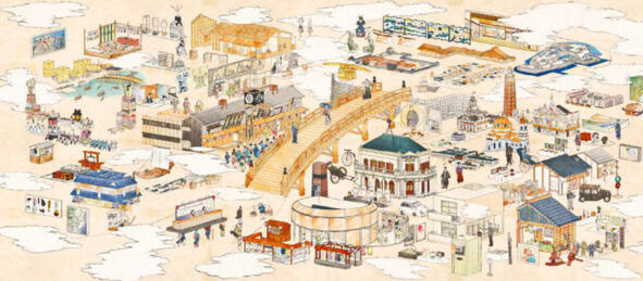 Вот рисунок, обобщающий все зоны музея. Виден большой мост, переход по которому ведет к старинной части Эдо, слева уже более поздняя эпоха, а справа более менее современная.