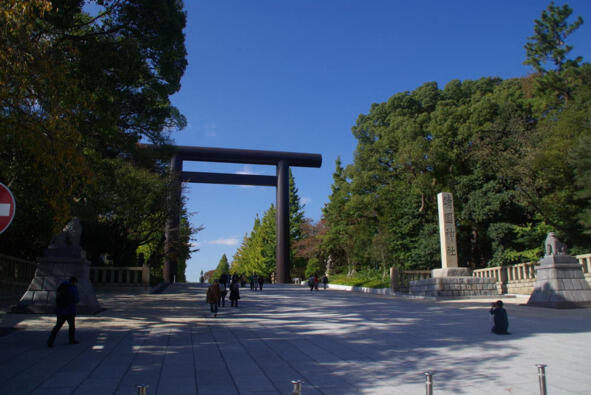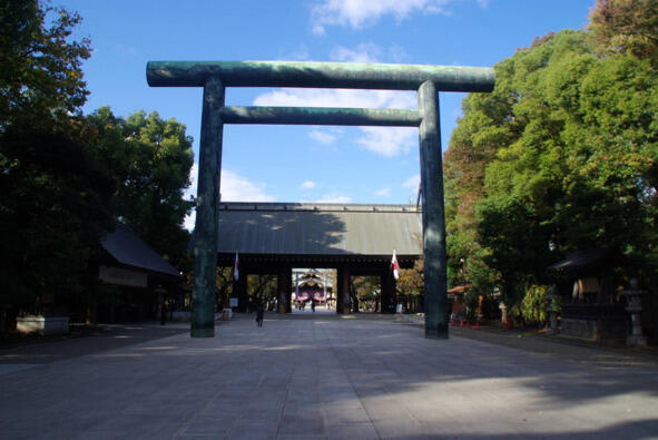 Как и перед любым храмом, перед Ясукуни установлены традиционные японские священные ворота тории, которые выглядят как два столба и горизонтальная перекладина вверху. Первые ворота, которые вам встретятся, были самыми большими в Японии на момент возведения, а именно в 1921 году. Их высота составляет 25 метров, а ширина 34 метра, но это копия, так как первоначально установленные ворота были разрушены. Пройдя ворота, вы попадете на аллею. Она приведет вас ко вторым воротам-тории, которые меньше, чем первые, хоть и являются самыми большими бронзовыми воротами в стране.
