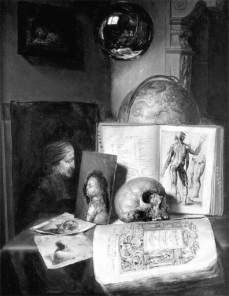Наконец, композиция «Урока анатомии» изящная аллюзия на фронтиспис Везалиевой книги в виде группового портрета ученых-медиков в процессе аутопсии. Художник не документирует медицинский эксперимент и не создает учебное руководство он изображает то, что непосредственно видит. «Урок анатомии доктора Тульпа» блистательный образец синтеза медицинской науки с изобразительным искусством. Через несколько лет голландский художник Симон Луттихейс (16101661) воплотит ту же идею в философском натюрморте, соединив анатомический трактат с работами Рембрандта и Яна Ливенса и разместив над ними стеклянный шар с интерьером мастерской живописца.