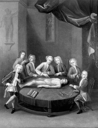 Чарльз Филлипс. Уильям Чеселден, дающий анатомическую демонстрацию шести зрителям в анатомическом театре в Гильдии цирюльников и хирургов в Лондоне, ок. 1740, холст, масло