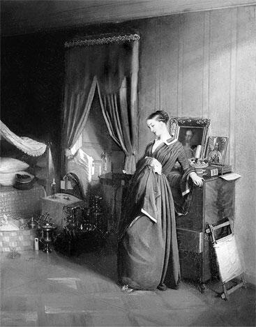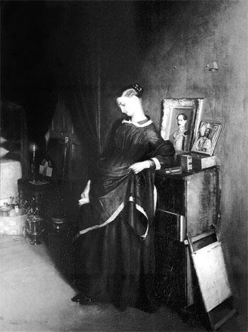Все имущество молодой вдовы уже описано кредиторами. Все обесчещено и опошлено: свеча служит не молитве, а нагреванию сургуча для печатей на долговых ярлыках. На комоде подле иконы Спасителя стоит портрет покойного мужа. Это автопортрет Федотова в гусарском мундире, словно пророчество собственной кончины. От поругания нищетой уцелело лишь несколько личных вещей горестных напоминаний о прошлом: корзинка с нитками, пяльцы с неоконченным вышиванием, нотный листок да толстая книга. Николай Харджиев и Эраст Кузнецов, авторы биографических повестей о Павле Федотове, сходятся во мнении, что это Евангелие.