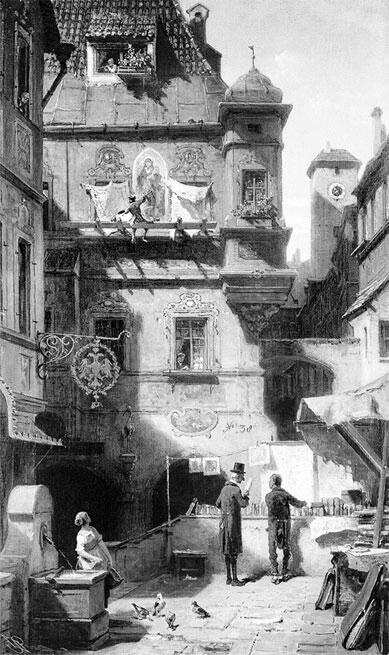 Немецкий художник Карл Шпицвег считается ярким представителем стиля бидермайер. Название Biedermeier образовано псевдонимом баварских поэтов Людвига Айхродта и Адольфа Кусмауля, публиковавших пародии на сентиментальную лирику от имени школьного учителя Готлиба Бидермайера (нем. Bieder простодушный, обывательский). Затем «господином Майером» стали называть городского обывателя, или, по-немецки, филистера[1]. В изобразительном искусстве для бидермайера характерны камерные идиллические сценки, романтизация монотонных будней, точно схваченных в мелких бытовых деталях.