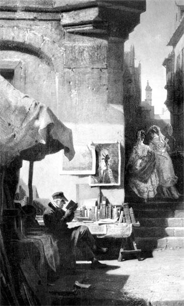 Карл Шпицвег. Антиквар, 1847, холст, масло. Среди выставленных на продажу товаров гравюра с «Книжного червя»