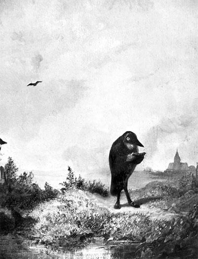 Есть у Шпицвега и весьма необычная картина, изображающая ворона с книгой. Причем книга почти сливается с фигурой, лишь слегка отсвечивая красноватым обрезом. Портрет читающей птицы завораживает, обдавая леденящим холодком готики. Образ парадоксально таинственный и прозаический, зловещий и уязвимый. Впрочем, едва ли он прочитывается как аллегория чернокнижия, хотя репродукция этой картины использована в оформлении обложки «Ворона» Эдгара По из серии «Bantam Classics» (1983). В птице просматриваются человеческие черты отнюдь не новый, но эффектный прием. Если же вглядеться внимательно, кажется, что это и вовсе человек в маске ворона.
