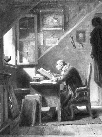 Во «внешнем» мире персонажи Шпицвега ведут суетную жизнь, ничем не примечательную, порой вовсе ничтожную а в уединении с книгой становятся отшельниками в «интеллектуальной пещере», уподобляясь философам-затворникам. И пусть скромны эти книжные святилища их служители из числа самых обыкновенных людей.