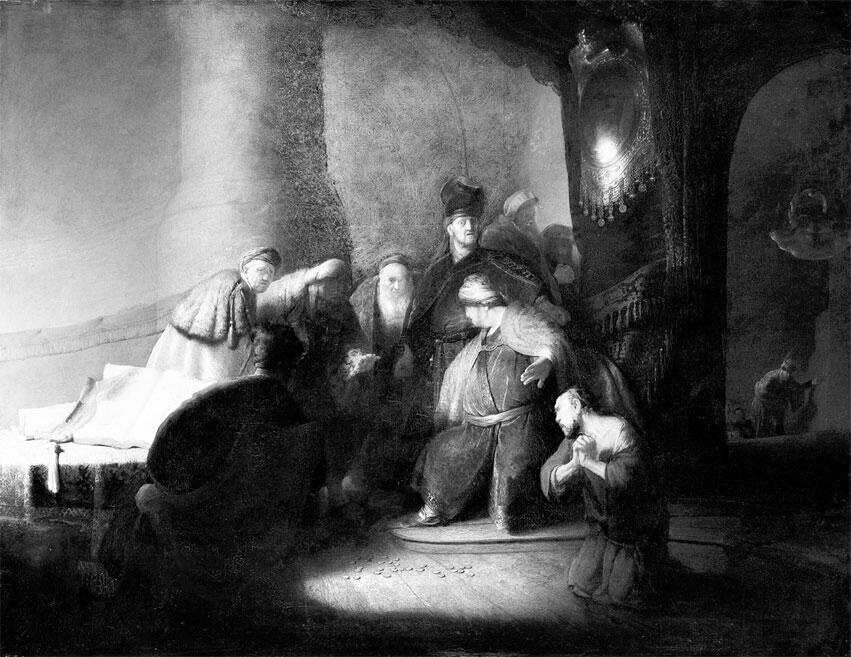 Рембрандт. Раскаявшийся Иуда возвращает тридцать сребреников, 1629, дерево, масло
