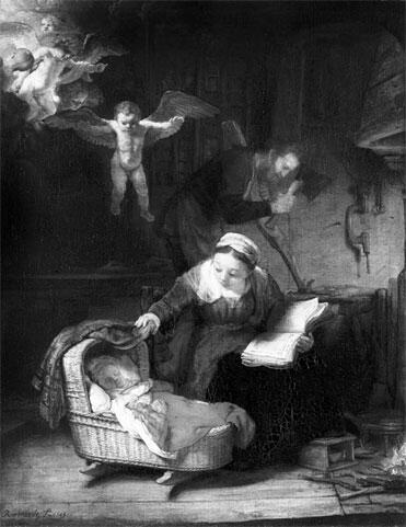 Аналогичное соединение религиозного с бытовым, камерного с монументальным в «Святом семействе с ангелами», одном из главных в творчестве Рембрандта. Мария отвлеклась от чтения Ветхого Завета, заботливо поправляя покрывало на спящем младенце Иисусе. Тридцать строк на каждой странице мерцают золотистыми бликами на соломенной колыбели Ребенка, который сам есть Книга Евангелие.