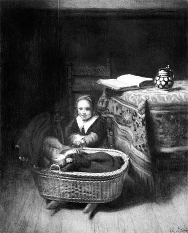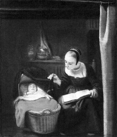 Этот сюжет виртуозно развивает один из учеников Рембрандта, Николас Мас (16341693), еще глубже проецируя его в повседневность. Маленькая девочка прилежно качает плетеную колыбель с грудничком, на столе раскрыта книга. Затем девочка взрослеет и вот уже сама склоняется над спящим малышом, укрытым красным одеяльцем, как на картине Рембрандта. И кажется: у нее на коленях та самая книга, что когда-то лежала на столе с пестрой скатертью. Только тогда книга выглядела фантастически большой, а теперь смотрится соразмерно читательнице. Сжимая пружину времени, этот образ соединяет два эпизода в одну историю. Молодая мать не ведает, какая судьба уготована ее ребенку, и в незатейливой бытовой сцене проступают контуры евангельского сюжета.