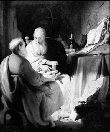 Опора на библейский будь то ветхозаветный или евангельский контекст придавала универсальные, вневременные смыслы даже обыденным вещам и повседневным ситуациям. Яркий пример «Диспут двух ученых», написанный мастером в возрасте двадцати двух лет. Несмотря на нейтральное авторское название, на картине легко узнаваемы святые апостолы Петр и Павел. Предметом обсуждения, скорее всего, служат Послания Петра, которые он держит в руках. Петр внимает доводам оппонента, заложив пальцами страницы с фрагментами, о которых идет речь. Послания Павла разложены на столе как ожидающий своего часа «контраргумент». Апостола Павла с большой книгой сообразно иконописному канону можно видеть в других рембрандтовских работах.