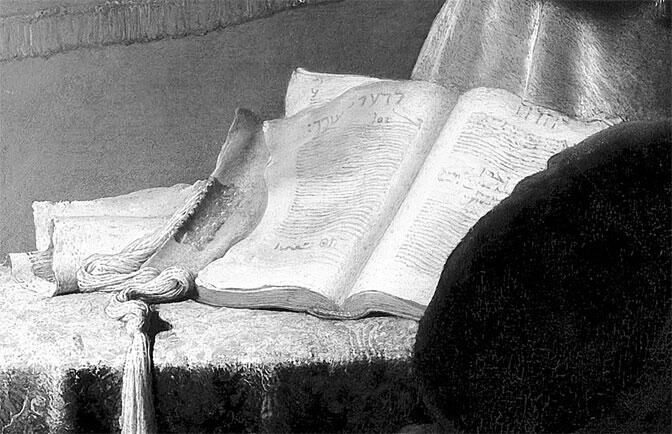 Особое место здесь занимает убранная золотом и серебром гигантская Тора, словно льющаяся мощным потоком белого света и заставляющая людей отступить в темную глубину помещения. Ее отраженный ослепительный свет падает на разбросанные монеты. В увеличенном фрагменте картины можно различить Тетраграмматон (четырехбуквенное непроизносимое имя Бога) и фразу «Знать заповеди твои». Гениальная кисть запечатлела священную книгу так, что зритель не может не поверить: в этой книге заключено всеведение.