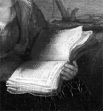 Любопытный факт: многие живописцы, не владевшие ивритом, отображали написанные на нем тексты стилизованными значками либо правильно, но произвольно выписанными отдельными буквами. Не таков был Рембрандт: вслед за художниками итальянской школы он добросовестно и грамотно воспроизводил еврейское письмо. Ряд ученых предполагают, что художник научился этому в Лейденском университете по двуязычной Библии на иврите и латыни. Кропотливая работа мастера над изображением иноязычных книг описана в романе американской писательницы Гледис Шмитт.