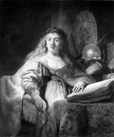 Минерву чаще представляли во всеоружии, с совой на плече и символизирующей мир веткой оливы. Книга вкупе с лавровым венком акцентирует иную функцию этой богини: покровительство искусствам, мудрости, научным занятиям. Ту же нетрадиционную иконографию, воплощающую гуманистические идеалы, художник уже использовал в небольшой панельной работе 1631 года, где увенчанная лавром Минерва сидит за столом с книгами, глобусом и лютней, а доспехи и оружие размещены на заднем плане. Возврат Рембрандта к образу мирной Минервы с атрибутами мудрости и знаний связывают с политической ситуацией в Нидерландах того времени.