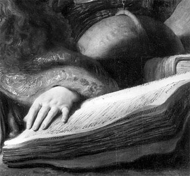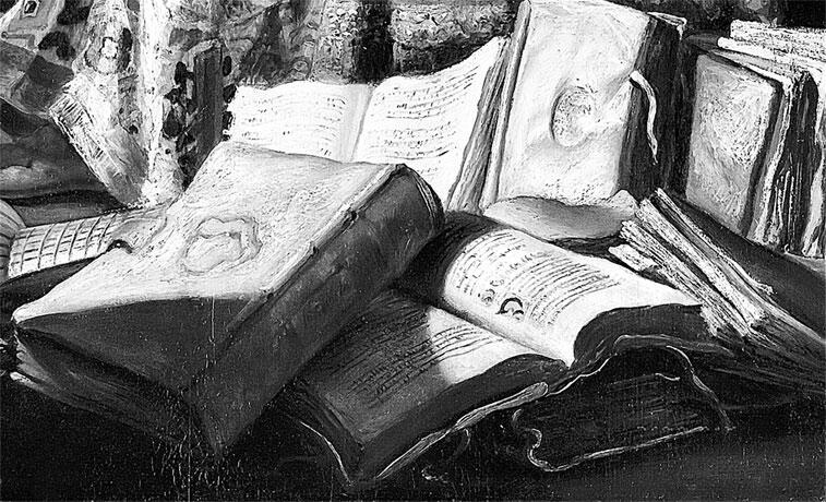 На переднем плане изображены лютня, скрипка и беспорядочная россыпь книг. Судя по раскрытым фолиантам, это тоже ноты, причем как рембрандтовской эпохи, так и средневековые, что позволяет истолковать их как универсальное воплощение и квинтэссенцию Музыки. Словно извлеченные с полок мировой музыкальной библиотеки и небрежно сваленные в тесной комнате они ждут инвентаризации, которую будет проводить сама История.