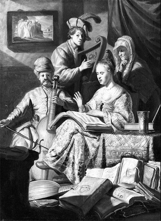 Книги присутствуют и в аллегорических работах Рембрандта. Вероятно, самый известный пример из раннего творчества «Концерт», именуемый также «Аллегория музыки». Двое мужчин музицируют на арфе и виоле да гамба. Молодая женщина поет, глядя в нотный альбом. Прочитать написанное в нем невозможно страницы заполнены условными мазками. Пожилая женщина внимает музыке и пению. На стене висит картина с сюжетом бегства Лота из Содома.