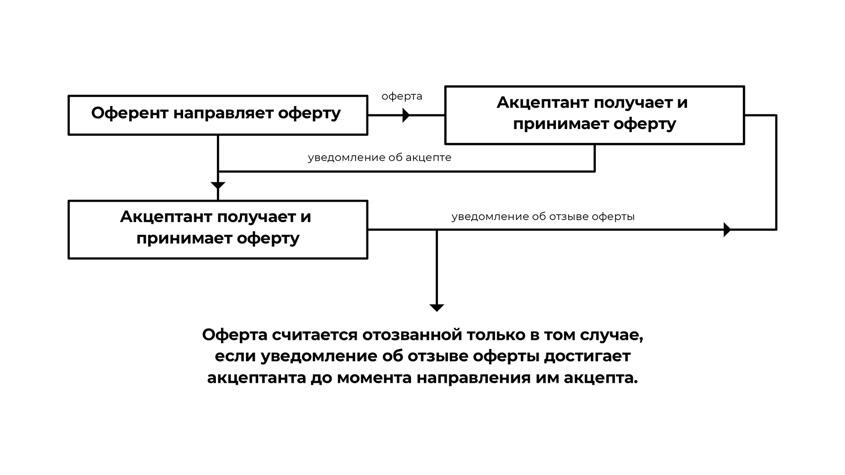 Закон предусматривает возможность отзыва акцепта, однако уведомление об отзыве должно быть получено оферентом ранее или в момент получения оферентом уведомление об акцепте (ст. 27 Закона «О договорах»).