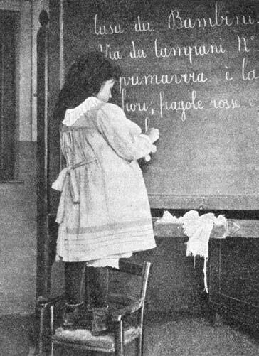 С этого дня монтессорская школа как бы помешалась на писании. С утра до ночи все дети писали. Приходя домой, они писали чем попало, на чём попало: на стенах, на полу, даже на хлебе матери находили написанные слова. Родители, спасая свои вещи от детей, накупили им карандашей и бумаги. Одна мать рассказывала, что её сын писал весь день, весь вечер и даже заснул с карандашом и бумагой в руках». «Такая импульсивная работа», говорит Монтессори, «которую я в первое время даже не могла обуздать, заставила меня подумать о мудрости природы, развивавшей устную речь мало-помалу, и развивавшей её одновременно и соответственно постепенному образованию мысли. Если бы, наоборот, природа поступала так же неблагоразумно, как я поступила, и сначала дала бы чувствам накопить богатый запас материала и мысли, развить целый мир понятий, а потом вдруг одарила бы устной речью немого до той поры ребёнка, сказав ему: «Иди, говори!» то мы увидали бы зрелище внезапного помешательства, при котором ребёнок начал бы говорить без отдыха и остановки до истощения лёгких и до потери голоса, произнося самые трудные и странные слова»