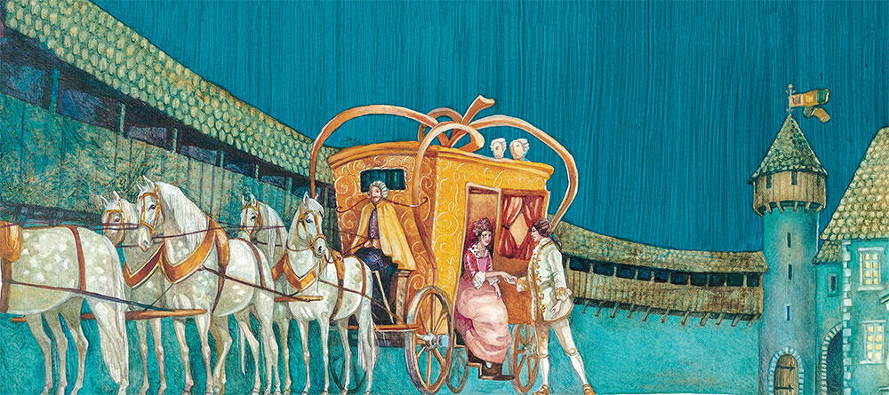 Недоумевая, зачем крёстной понадобилась тыква, Золушка сбегала на огород, а когда вернулась, фея разрезала тыкву пополам, коснулась обеих половинок волшебной палочкой, и в тот же миг тыква превратилась в роскошную золочёную карету.