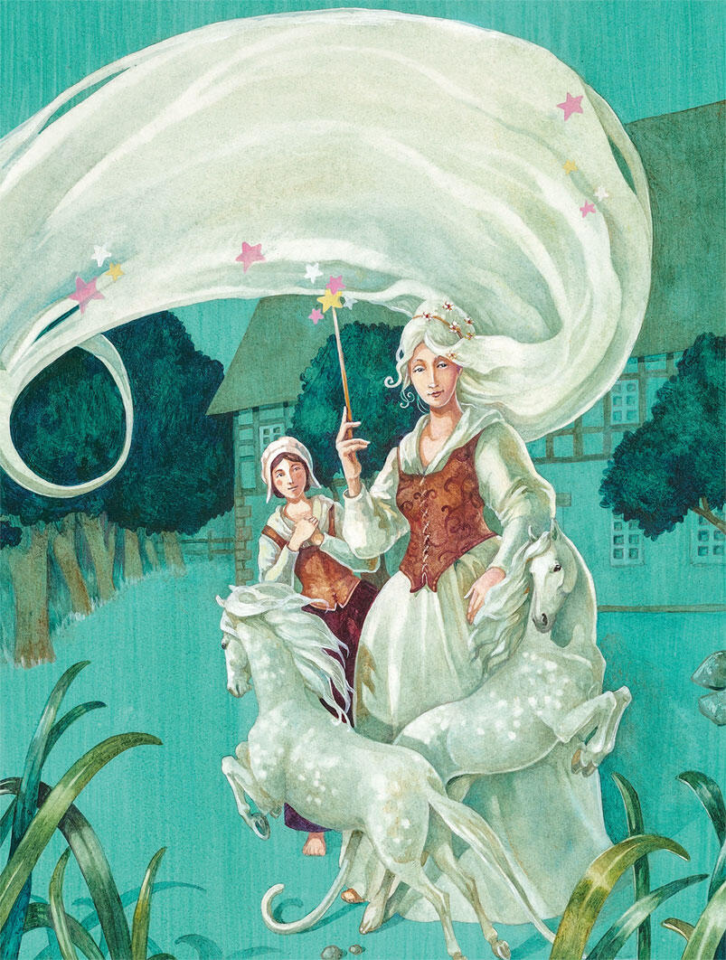 Затем крёстная велела Золушке принести мышеловку и выпустить мышей, которые в неё попали. Когда животные выбежали из клетки, фея притронулась к ним волшебной палочкой, и в тот же миг мыши превратились в прекрасных белоснежных лошадей.