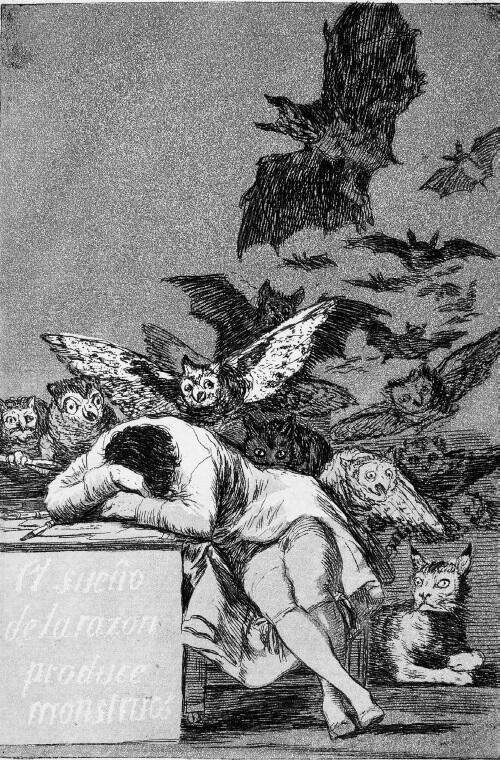 К 1797 г. относится создание офорта, на котором художник изобразил самого себя, сидящего, уронив голову на конторку и закрыв руками лицо. А вокруг носятся в воздухе отвратительные летучие мыши и совы Иные из них уже вцепились в его спину когтями. Картина так и называется «Сон разума рождает чудовищ».